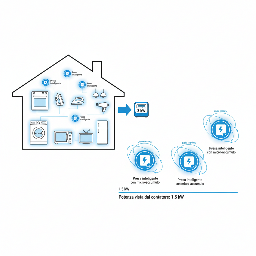 Questo brevetto introduce un sistema distribuito che consente di risparmiare la potenza impegnata in ambienti residenziali e industriali, senza modificare le abitudini d'uso. Attraverso prese intelligenti con micro‑accumulo e cicli coprimi asincroni, il sistema evita che i picchi di assorbimento coincidano, mantenendo la potenza vista dal contatore stabile e contenuta. È una soluzione elegante, scalabile e brevettata, che trasforma la logica matematica in efficienza energetica reale.